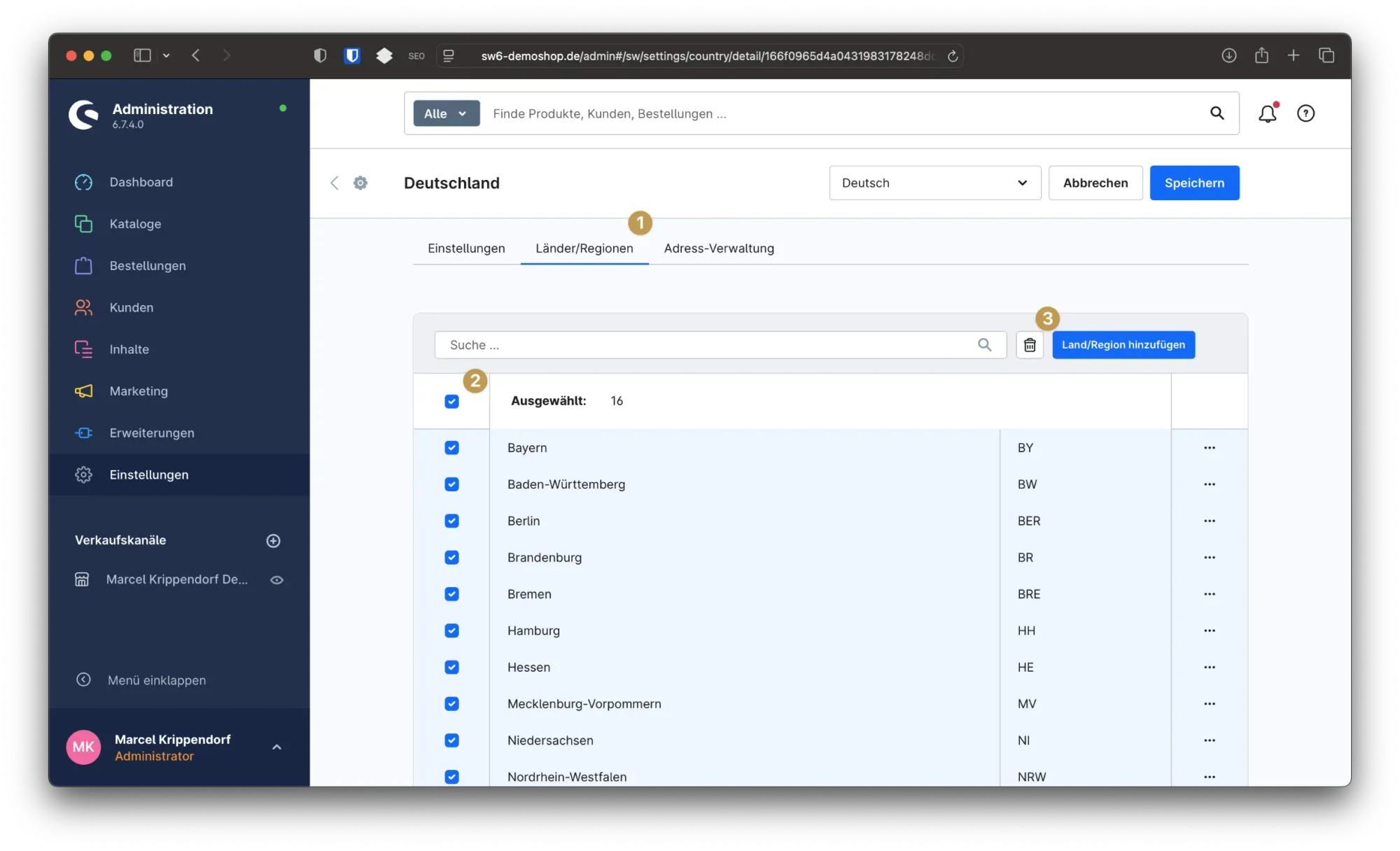 Sobald du im Reiter Länder/Regionen bist, markierst du die komplette Liste der Bundesländer. Du siehst dann, dass 16 Einträge ausgewählt sind, was der Anzahl der deutschen Bundesländer entspricht. Danach klickst du auf das Papierkorb Symbol, um die Bundesländer zu löschen. Damit ist der größte Teil der Arbeit schon erledigt.