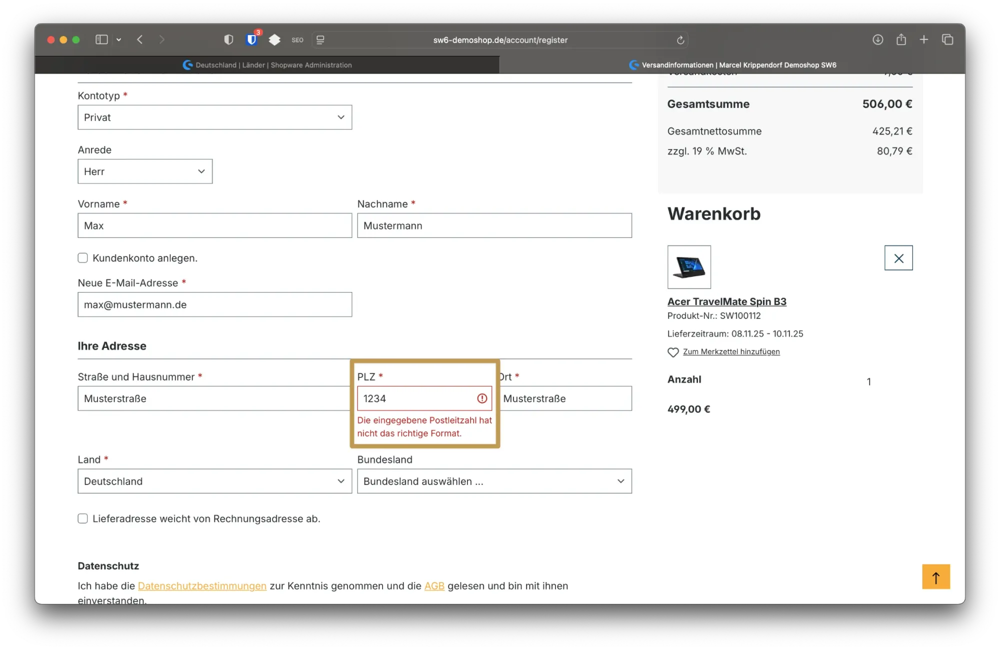Wenn du jetzt den Checkout öffnest, erkennst du sofort, dass das Feld für die Postleitzahl mit einem Sternchen als Pflichtfeld markiert ist. Gibst du zum Beispiel eine zu kurze oder ungültige Postleitzahl ein, wie etwa „1234“ für Deutschland, erscheint beim Weiterklicken eine Fehlermeldung mit dem Hinweis: