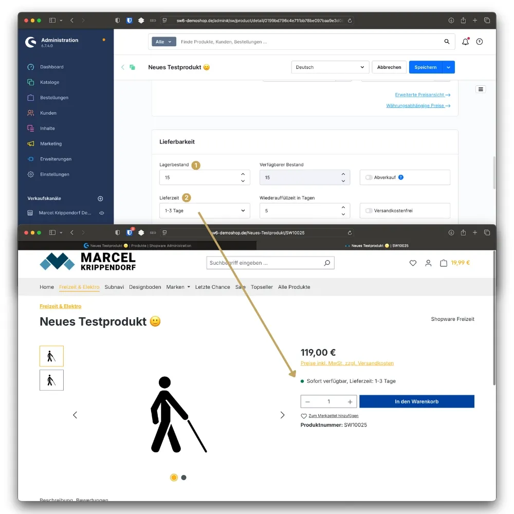 Ein Produkt mit Lagerbestand, zum Beispiel 15 Stück, ist sofort verfügbar. Die Lieferzeit, zum Beispiel 1 bis 3 Tage oder 1 bis 2 Wochen, wird direkt so im Shop angezeigt. Deine Kunden können das Produkt sofort bestellen, weil es im Lager liegt und direkt verschickt werden kann. Die Lieferzeit, die du eingibst, erscheint 1:1 im Shop.