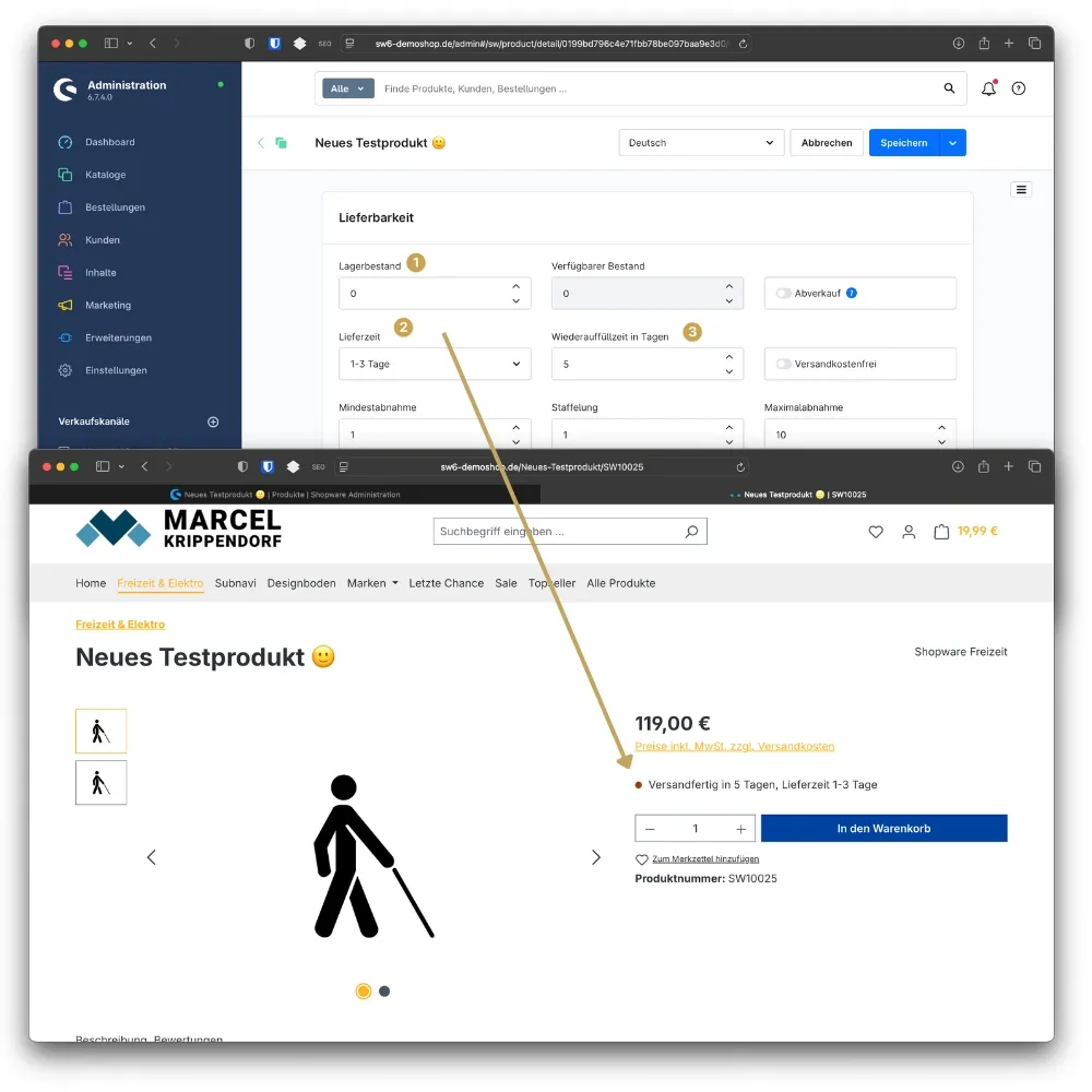 Wenn ein Produkt Lagerbestand hat, ist das Szenario am einfachsten. In deinem Produkt findest du im Bereich Lieferbarkeit den aktuellen Lagerbestand, die Lieferzeit und die Wiederauffüllzeit in Tagen.