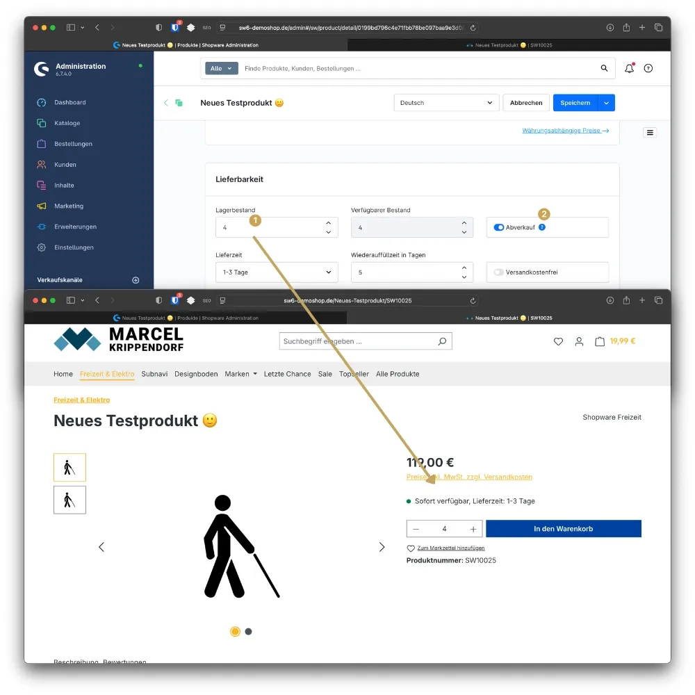 Wenn noch Lagerbestand vorhanden ist, bleibt das Produkt sofort verfügbar und kann mit der normalen Lieferzeit bestellt werden. Shopware verhindert aber, dass deine Kunden mehr bestellen können als auf Lager ist. Wenn du zum Beispiel noch 2 Stück im Lager hast und eine Maximalabnahme von 10 festgelegt hast, lassen sich trotzdem nur 2 in den Warenkorb legen. Ein Verkauf unter 0 ist bei aktiviertem Abverkauf nicht möglich.