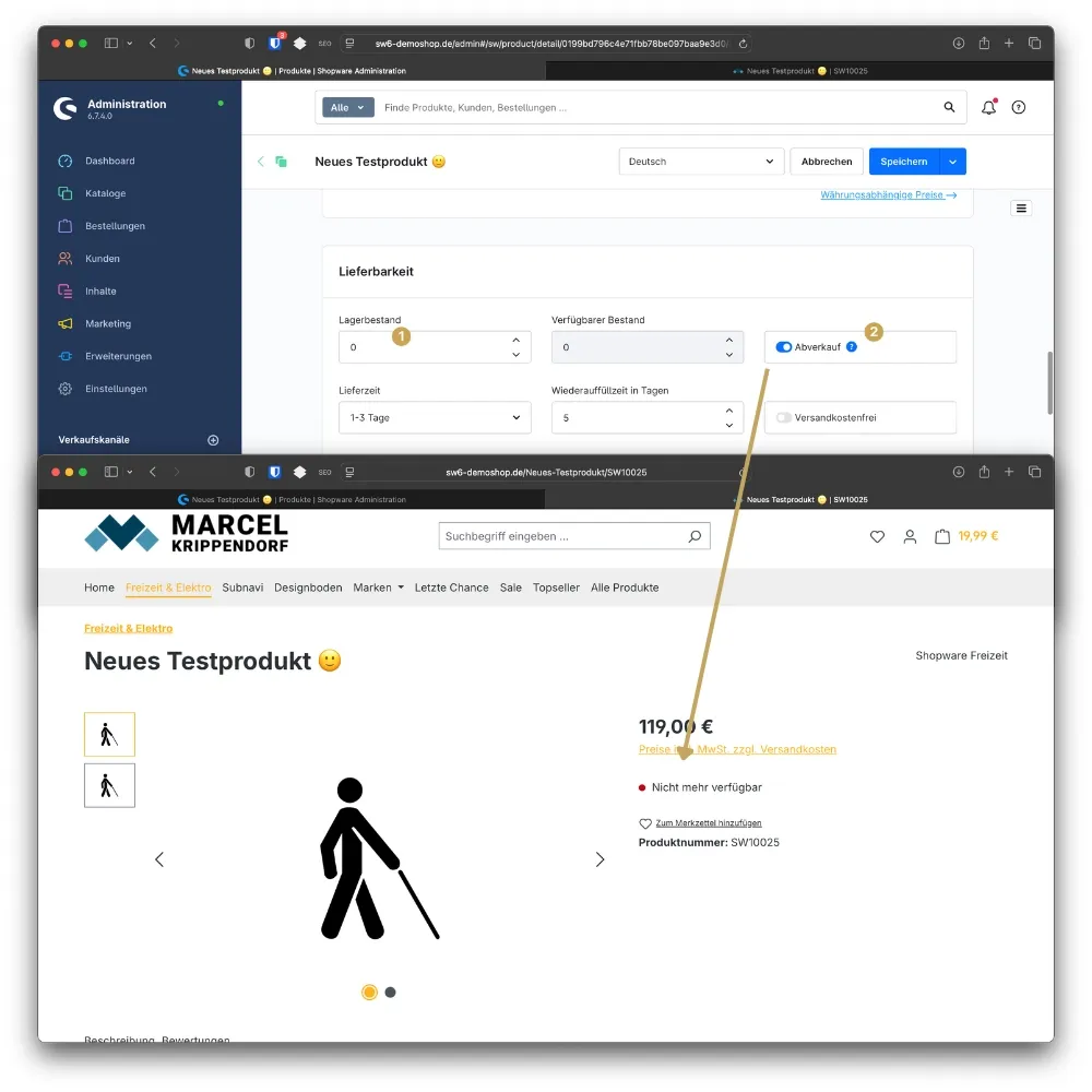 Sobald der Lagerbestand auf 0 fällt, zeigt Shopware nicht mehr verfügbar an. Das Produkt kann nicht mehr bestellt werden.