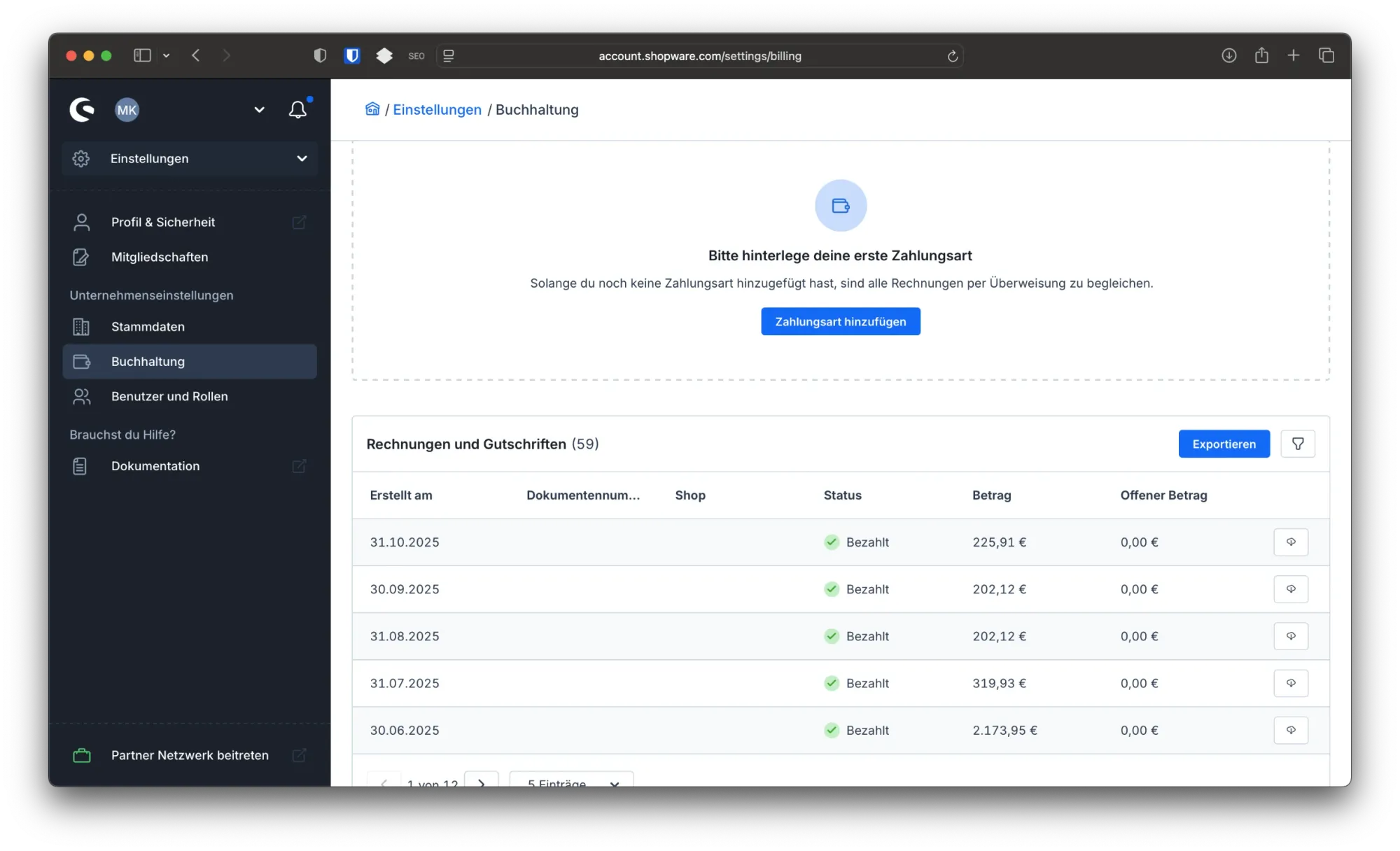 Du findest alle Shopware Rechnungen direkt in deinem Shopware Account im Bereich Einstellungen -> Unternehmenseinstellungen und dort im Bereich der Buchhaltung. Dort kannst du alle aktuellen und früheren Rechnungen herunterladen. Die Rechnungen enthalten ausschließlich die Lizenzkosten, die im jeweiligen Monat fällig sind. Damit hast du eine klare Übersicht über alle Abrechnungen und kannst sie sauber in deiner Buchhaltung weiterverarbeiten.